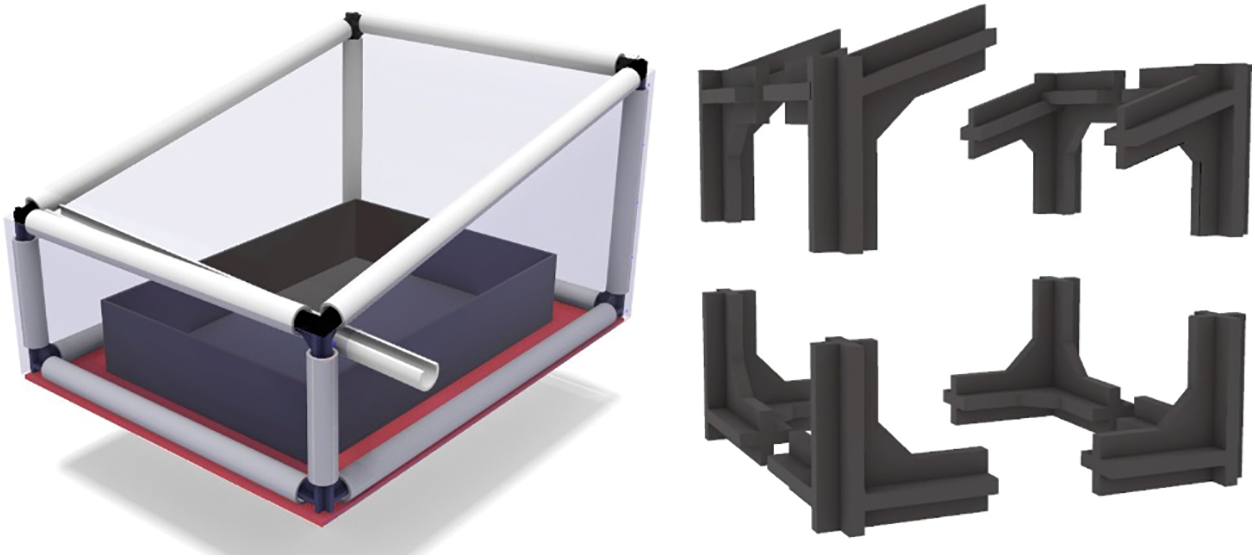 Two considerations were made in the choice of materials: portability and accessibility to hardware stores and supermarkets. The cross joints were manufactured using additive manufacturing (3D printing), given their required function and their non-commercial characteristic angle of 20°. This led to the creation of the following bill of materials: