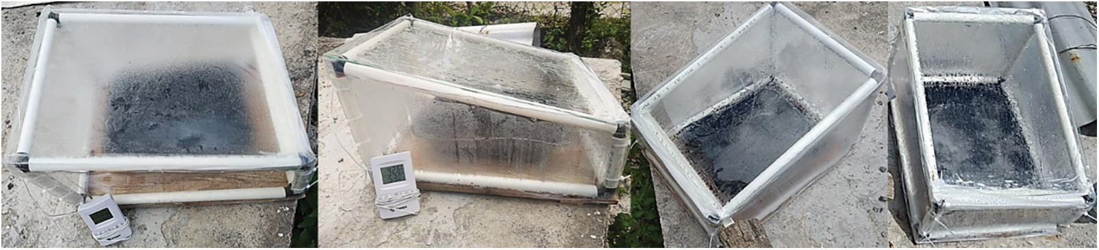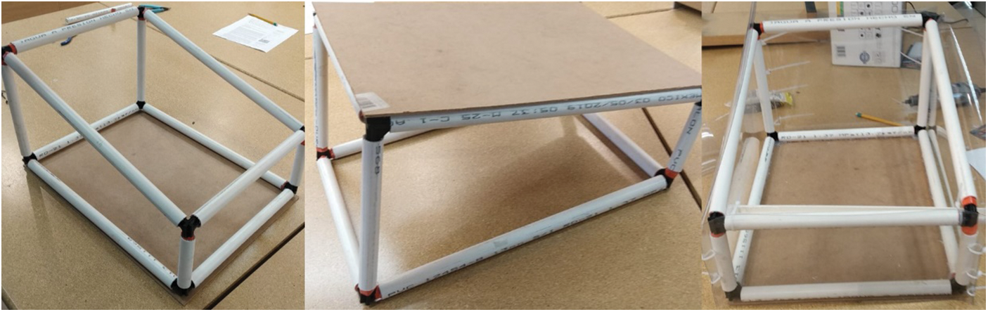The first step is to assemble the PVC pipes and the PLA cross joints that make up the structure. Next, the wooden base is attached to the structure with the 1/8″ flat-head wood screw. The next step is to place the water-distilled collecting tube, and finally, the PET walls are secured to the structure with the plastic straps. The result is shown in Fig. 3.