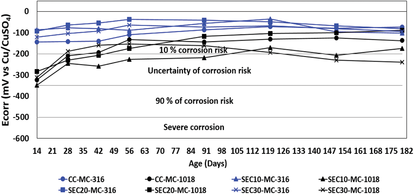 Fig. 3 shows the behavior of the Ecorr, half-cell potential after 180 days of exposure to sulphates (3.5% MgSO4 solution) of reinforced specimens with steel AISI 1018, CC-SM-1018, SEC10-SM-1018, SEC20-SM-1018 and SEC30-SM-1018, such as the reinforced with AISI 316 SS, CC-SM-316, SEC10-SM-316, SEC20-SM-316 and SEC30-SM-316. The specimens with steel AISI 1018 present a similar behaviour to the observed in the specimens exposed to the control medium from the curing stage until day 114, with a tendency to passivation only for the specimens CC-SM-1018, placing itself in a zone of 10% corrosion risk by the end of monitoring, for the specimens with 20% and 30% of SCBA-SF, SEC20-SM-1018 and SEC30-SM-1018, with values of Ecorr of −231 mV and −282 mV, respectively, indicating uncertainty of corrosion risk, according ASTM C-876-15 standard.