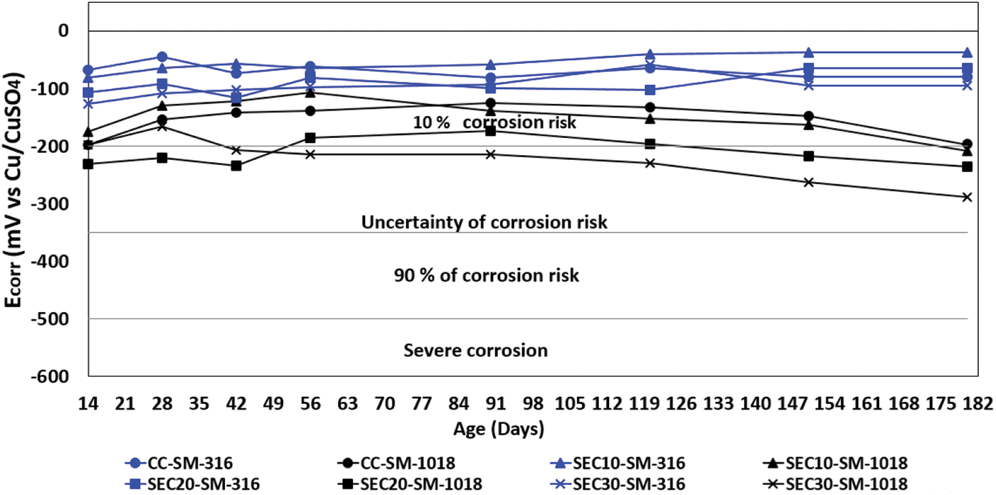 For the case of the specimens reinforced with AISI 316 SS, CC-SM-316, SEC10-SM-316, SEC20-SM-316 and SEC30-SM-316, the values of Ecorr present a very similar behaviour to the exposed to the control medium, with values during the curing stage that go from –141 mV to –78 mV, behave that keeps during all the time of exposition to the aggressive medium, with minor values to –100 mV in all the specimens, values of Ecorr that according to the norm ASTM C-876-15 indicates a 10% of corrosion risk, not identifying an influence of the type of concrete, but it is associated to the high protection that offers the steel AISI 316 against the corrosion for sulphates, the reported values in the present investigation agree with the reported in the literature [60].
