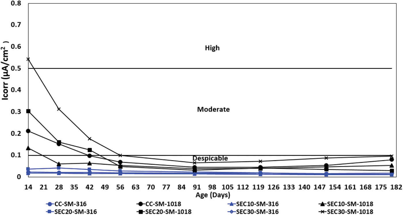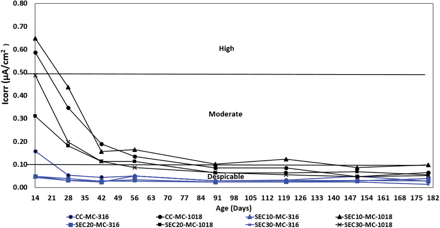 Fig. 5 shows that for the specimens CC-SM-1018, SEC10-SM-1018, SEC20-SM-1018 and SEC30-SM-1018, reported a corrosion rate, Icorr of between 0.54 and 0.13 µA/cm2, in the first 28 days (curing stage), behaviour observed in the specimens exposed to the control medium. However, upon coming into contact with the aggressive medium (3.5% MgSO4 solution), the specimens with AISI 1018 report Icorr values less than 0.1 µA/cm2, which indicates a negligible level of corrosion, an apparent protection effect of the aggressive medium, observed. in other research works [63]. Even though after day 120 of exposition, it presents a tendency of increments in the values of Icorr for the four specimens CC-SM-1018, SEC10-SM-1018, SEC20-SM-1018 and SEC30-SM-1018, which agrees with the values of Ecorr reported in Fig. 3, for mentioned specimens, the tendency to more great values of Icorr keeps until the end of the monitoring, reaching almost the activation of the system for the day 180 two specimens, the el CC-SM-1018 and the SEC30-SM-1018, with nearby values to 0.10 µA/cm2, and keeping the specimens SEC10-SM-1018, SEC20-SM-1018 at the end of the monitoring with 0.08 and 0.06 µA/cm2, respectively, which indicates that in the conditions of the present study Sustainable Ecological Concrete with 10%, 20%, and 30% of substitution of CPC for the combination of SCBA-SF presented a higher protection against corrosion at the steel AISI 1018.